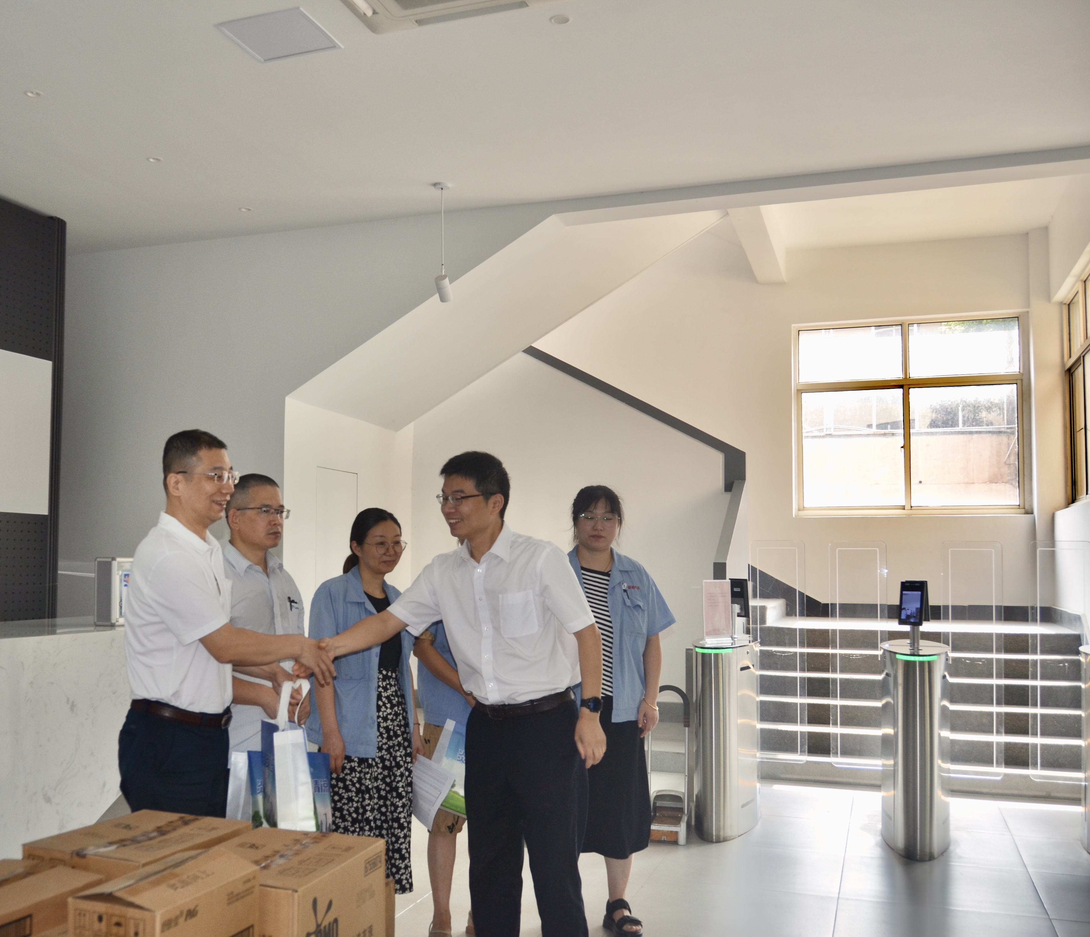“炎炎夏日送清涼,濃濃關愛沁人心。”近日,徐舍鎮黃鎮長攜鎮總工會及相關領導一行來我司開展送清涼活動,走訪慰問奮斗在高溫崗位的一線員工,為他們送去了防暑降溫用品,讓他們在酷暑中感受到一絲清涼。活動中,徐舍鎮相關領導及工會向奮戰在一線的勞動者表示由衷的感謝和問候,與員工代表們親切交談,叮囑大家注意勞逸結合,防暑降溫,確保安全生產工作有序進行。開展“夏送清涼"的活動,是工會關心職工生活,保障職工權益的重要舉措,我司把防暑降溫工作作為夏季重點工作來抓。切實關心職工身體健康和勞動安全。把防暑降溫工作和勞動安全保障落實到各高溫崗位的職工,讓他們在炎炎夏日感受到物質、精神的雙清涼。